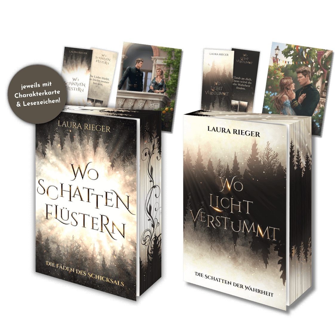Erlebe die ersten zwei Bände der Wo Schatten flüstern-Trilogie – mit zwei illustrierten Charakterkarten & passendem Lesezeichen.